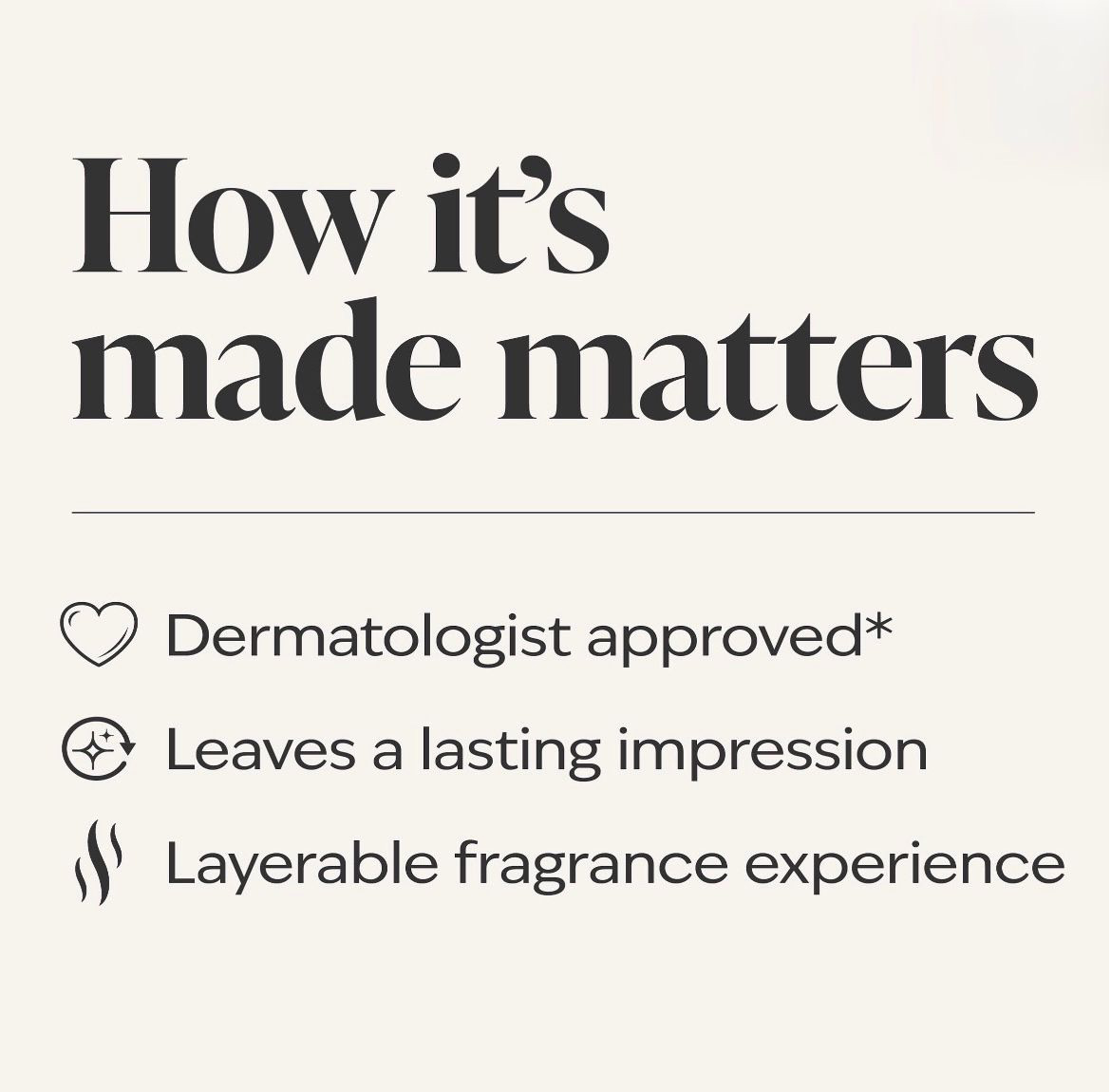 Dermatologist approved (based on review of independent testing by board-certified dermatologist). Leaves a lasting impression. Creates a layerable fragrance experience. The truest way to fragrance. Designed for great coverage.
