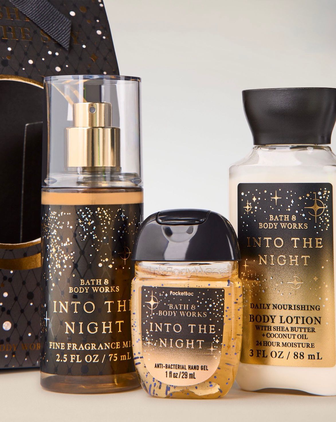 Includes travel size body lotion (3 fl oz), travel size fine fragrance mist (2.5 fl oz) and PocketBac hand sanitizer (1 fl oz).