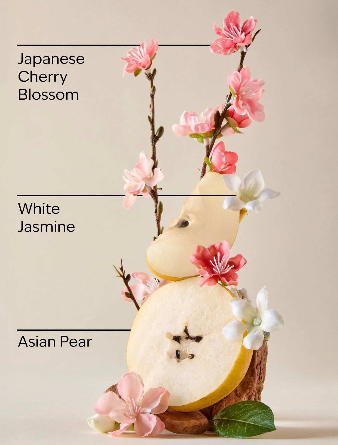 Fragrance notes: Japanese cherry blossom, Asian pear, fresh mimosa petals, white jasmine and blushing sandalwood.
