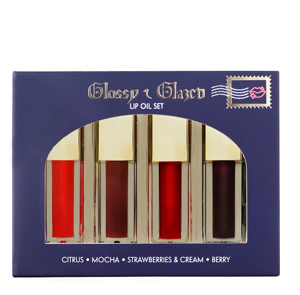 * 4 Glossy & Glazed Lip Oil – Coral (Citrus), Brown (Mocha), Red (Strawberries & Cream), Plum (Berry)