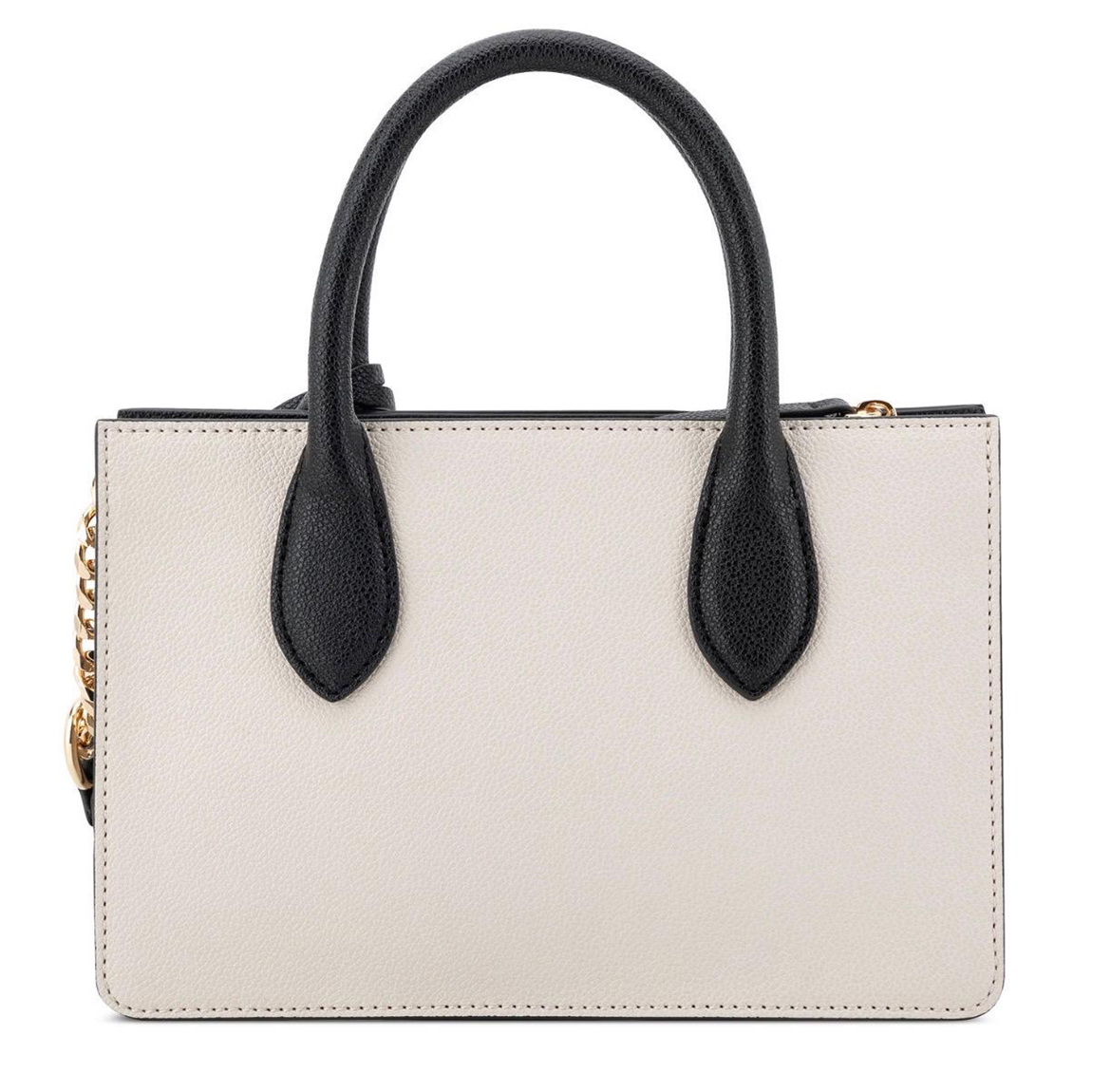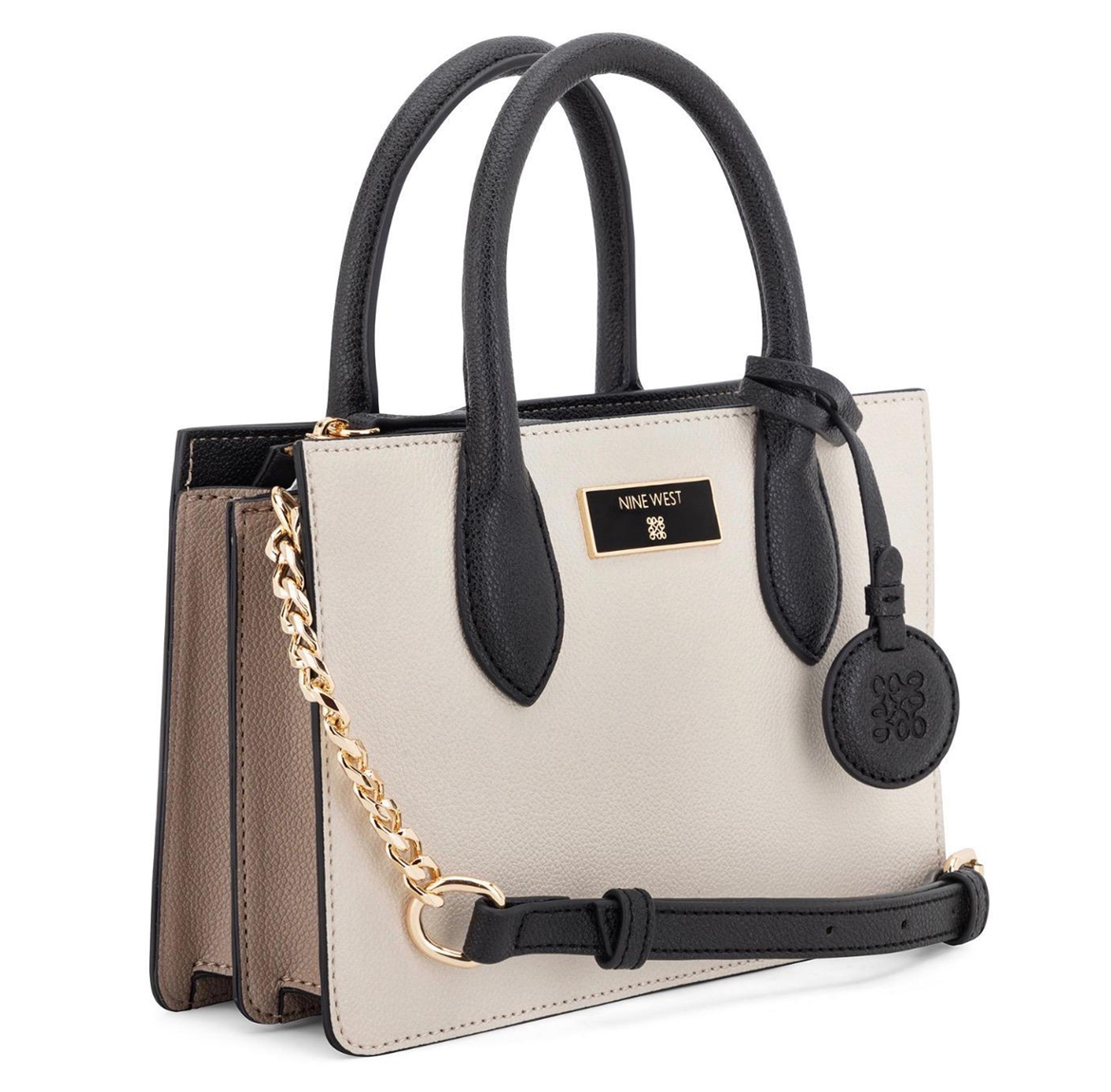 Nine West designer Magdalina mini tote crossbody with internal slip and zipper pocket organization and external hardware details and branding. Removable crossbody chain strap for hands free ease style or wear handheld.