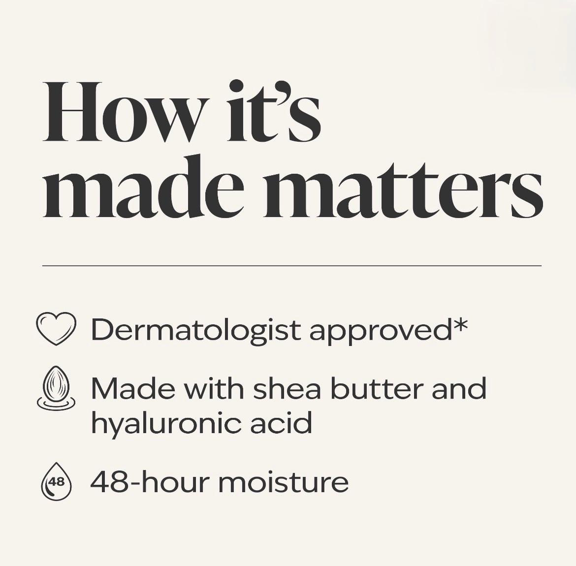 What it does: provides 48-hour moisture to defend against dry skin. Why you’ll love it: Dermatologist approved (based on review of independent testing by board-certified dermatologist). Made with shea butter and hyaluronic acid.