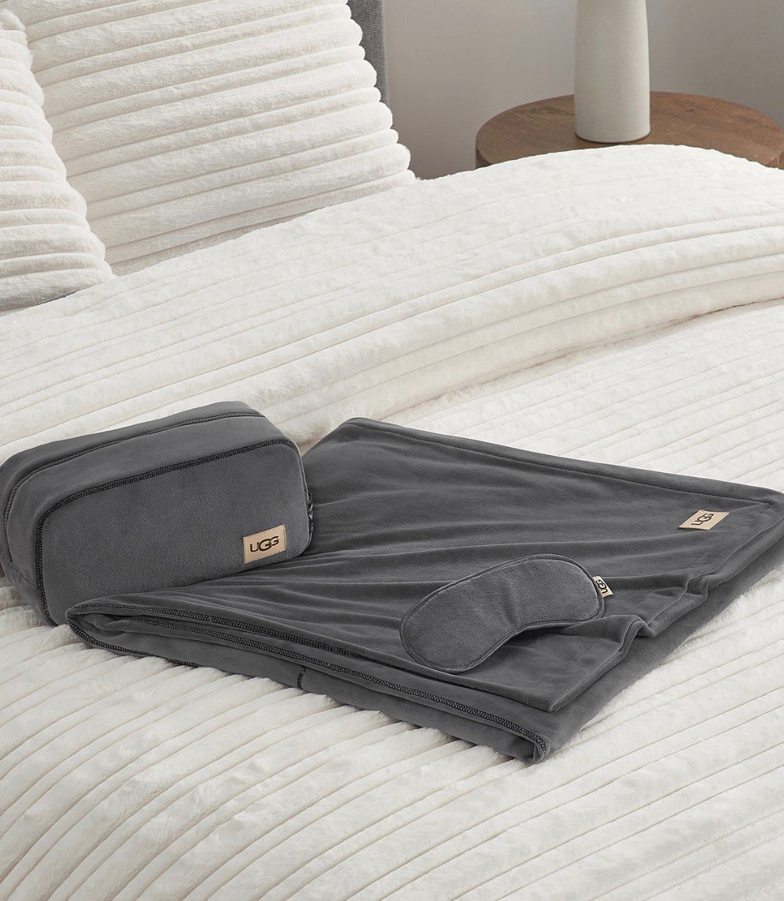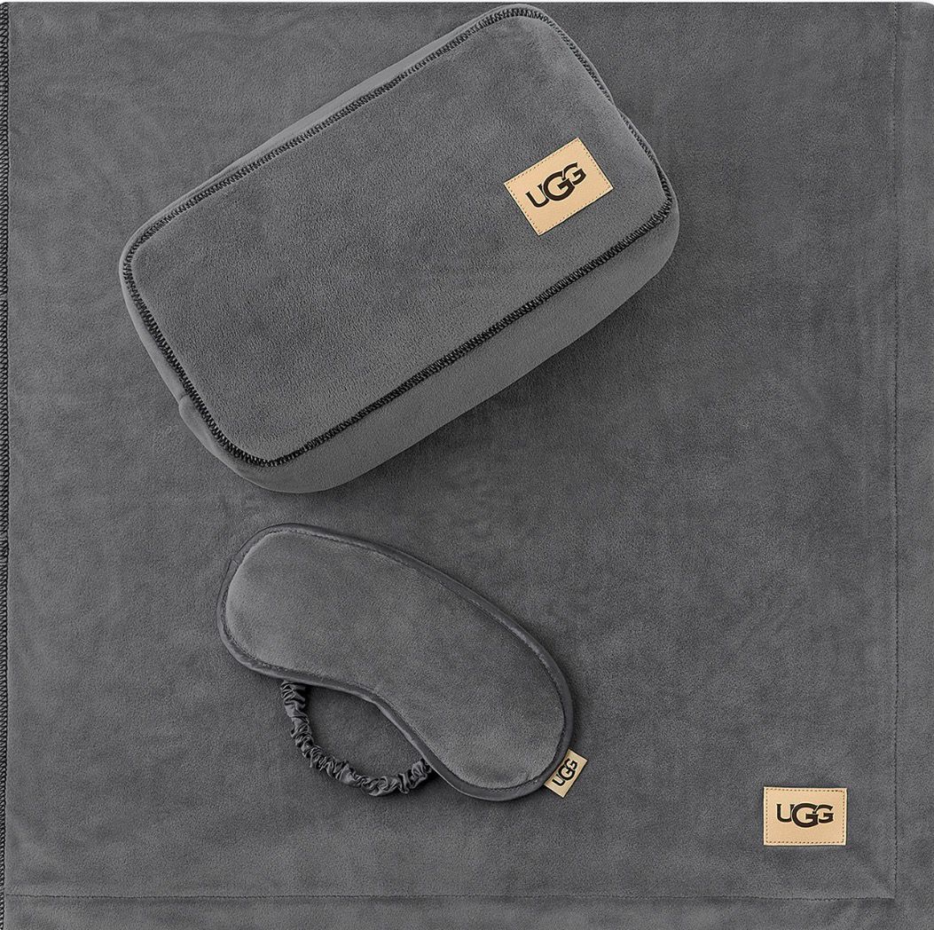 UGG®, a soft blanket and eye mask in a carrying case perfect for throwing in a backpack or carry-on.