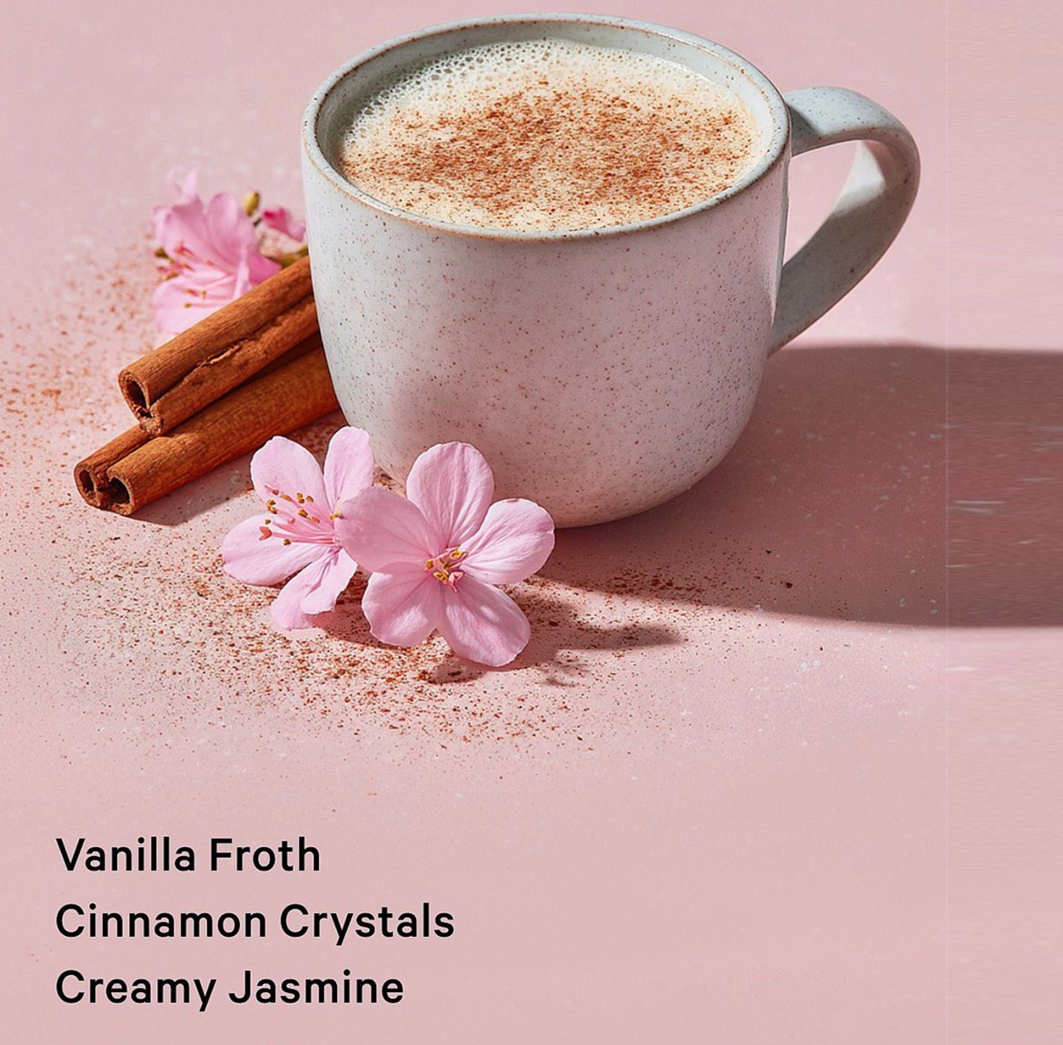 Top: Spiced Horchata, Vanilla Froth; Heart: Cinnamon Crystals, Pink Jasmine; Base: Velvet Sandalwood
