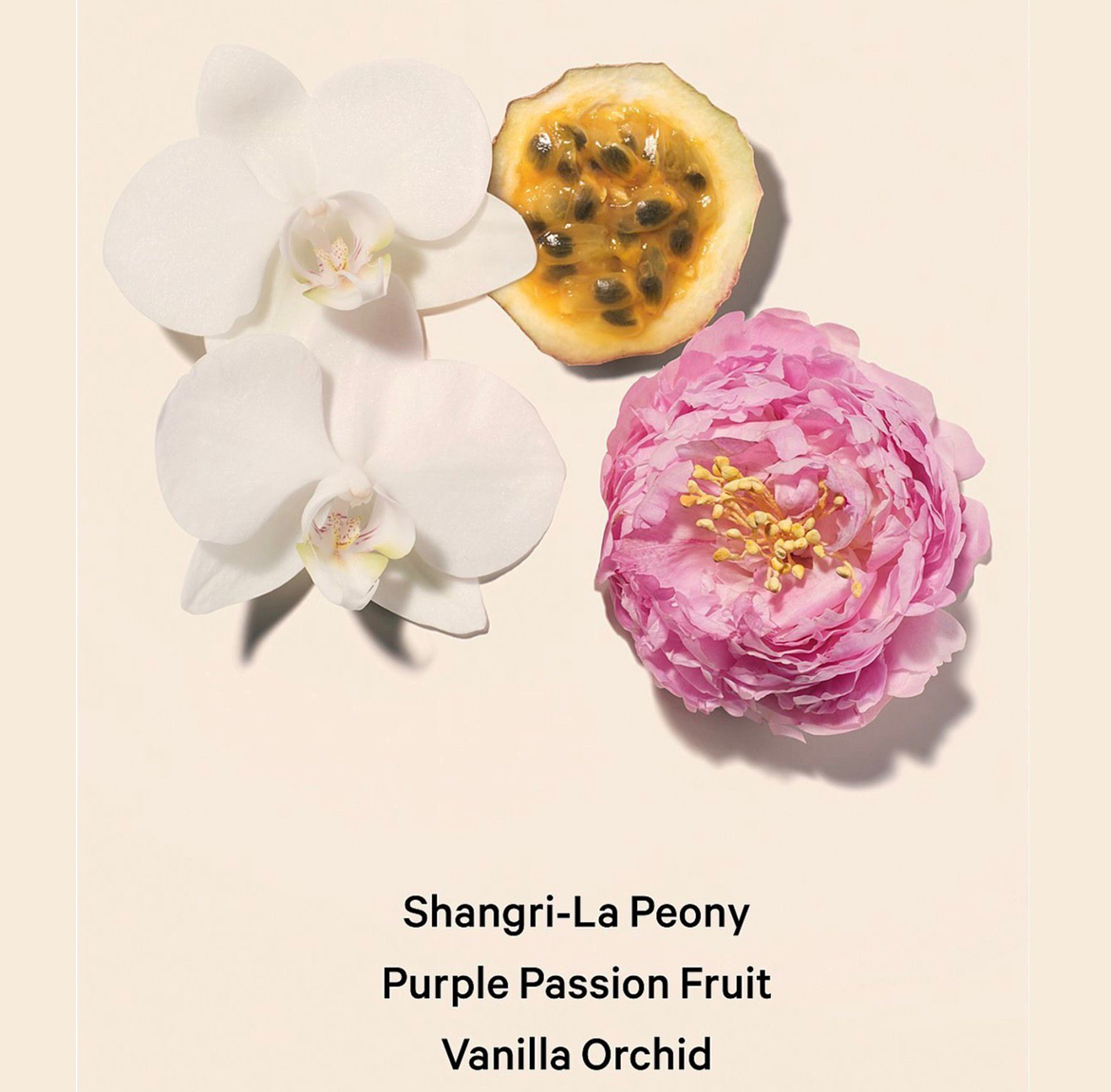 * Notes: purple passion fruit, Shangri-La peony, vanilla orchid