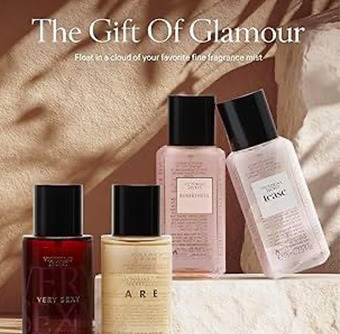 Victoria’s Secret offers several variations of their 4-piece fine fragrance mini mist gift sets, featuring 75 ml (2.5 fl oz) bottles that are TSA-friendly for travel.