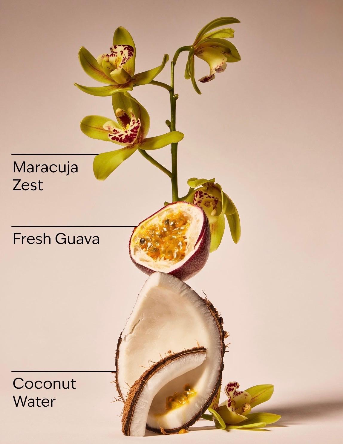 Fragrance notes: fresh guava, maracuja zest and coconut water.