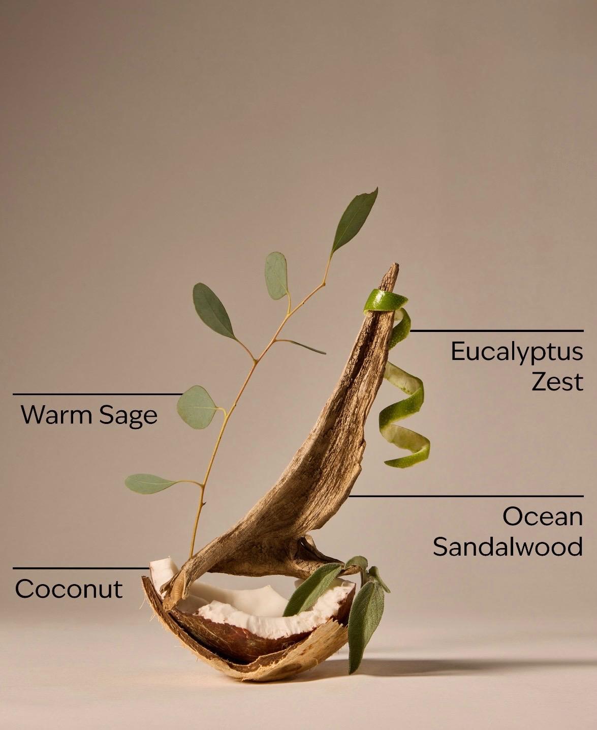 Breathe in the serenity of a coastal escape. Fragrance notes: ocean sandalwood, warm sage, eucalyptus zest and coconut.