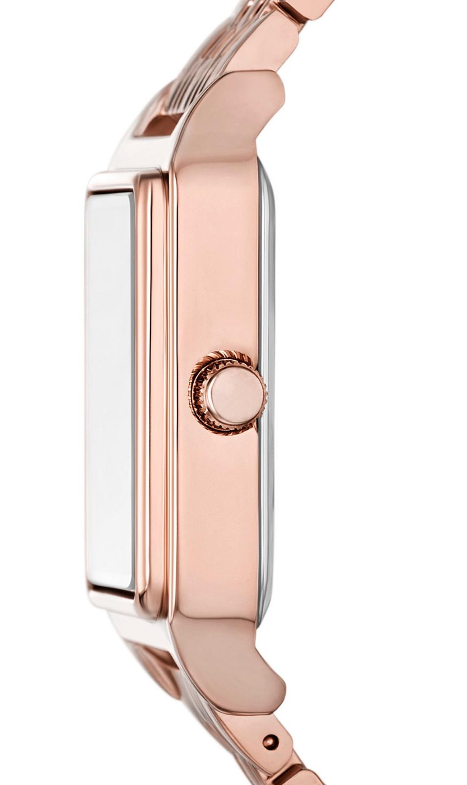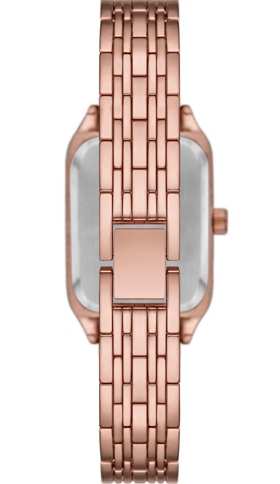 The rectangular rose gold-tone case pairs seamlessly with a matching sunray dial and strap, creating a cohesive design in warm metallic tones.